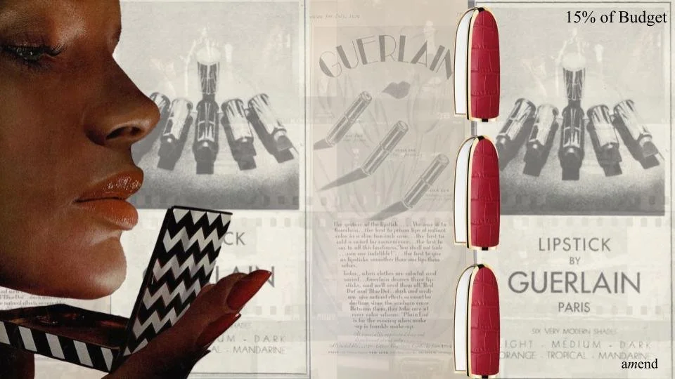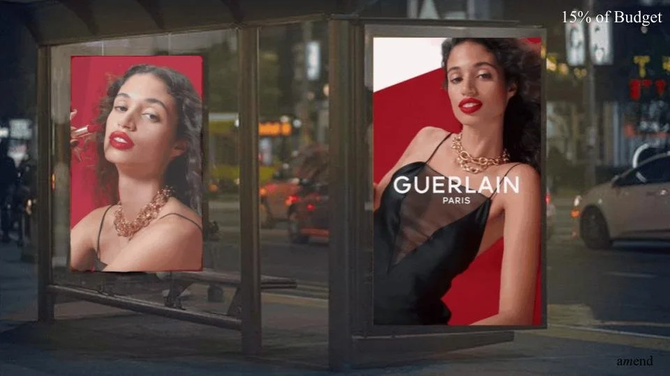 amend partnered with Guerlain, known for its luxurious perfumes, cosmetics, and skincare. As part of this collaboration, we launched a special edition customizable lipstick collection featuring our signature brand name engraved directly onto each product. The campaign debuted in early June and was promoted through high-visibility ads at select bus shelters across the city. Guerlain brought our Lumìere collection to life by translating our four signature colors into stunning lipstick shades, Cabernet quickly became the standout favorite. To complement the lipsticks, we also offered customizable cases, each designed to reflect the distinct style of a different decade. These lipsticks seamlessly blended timeless style with modern individuality.