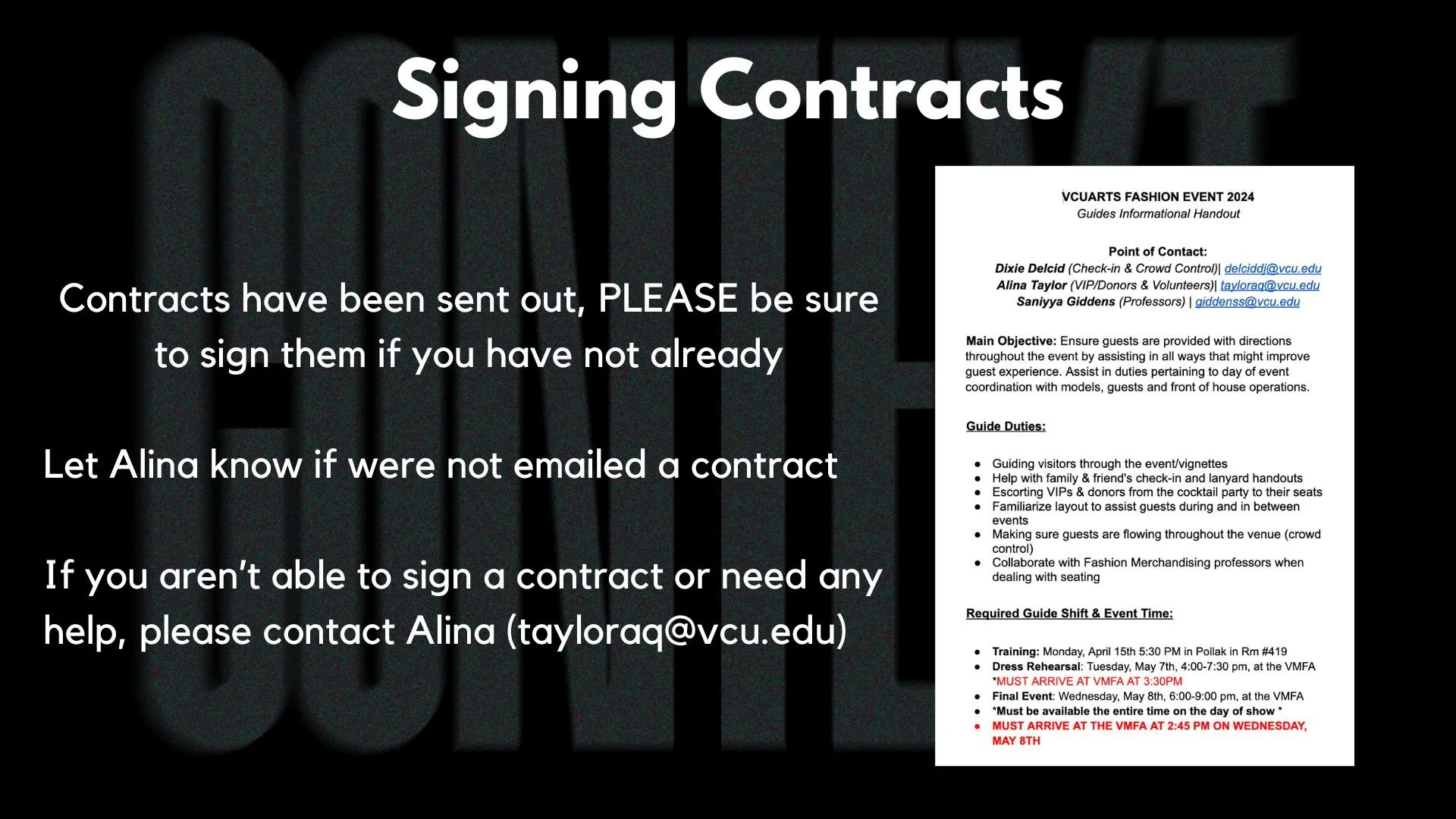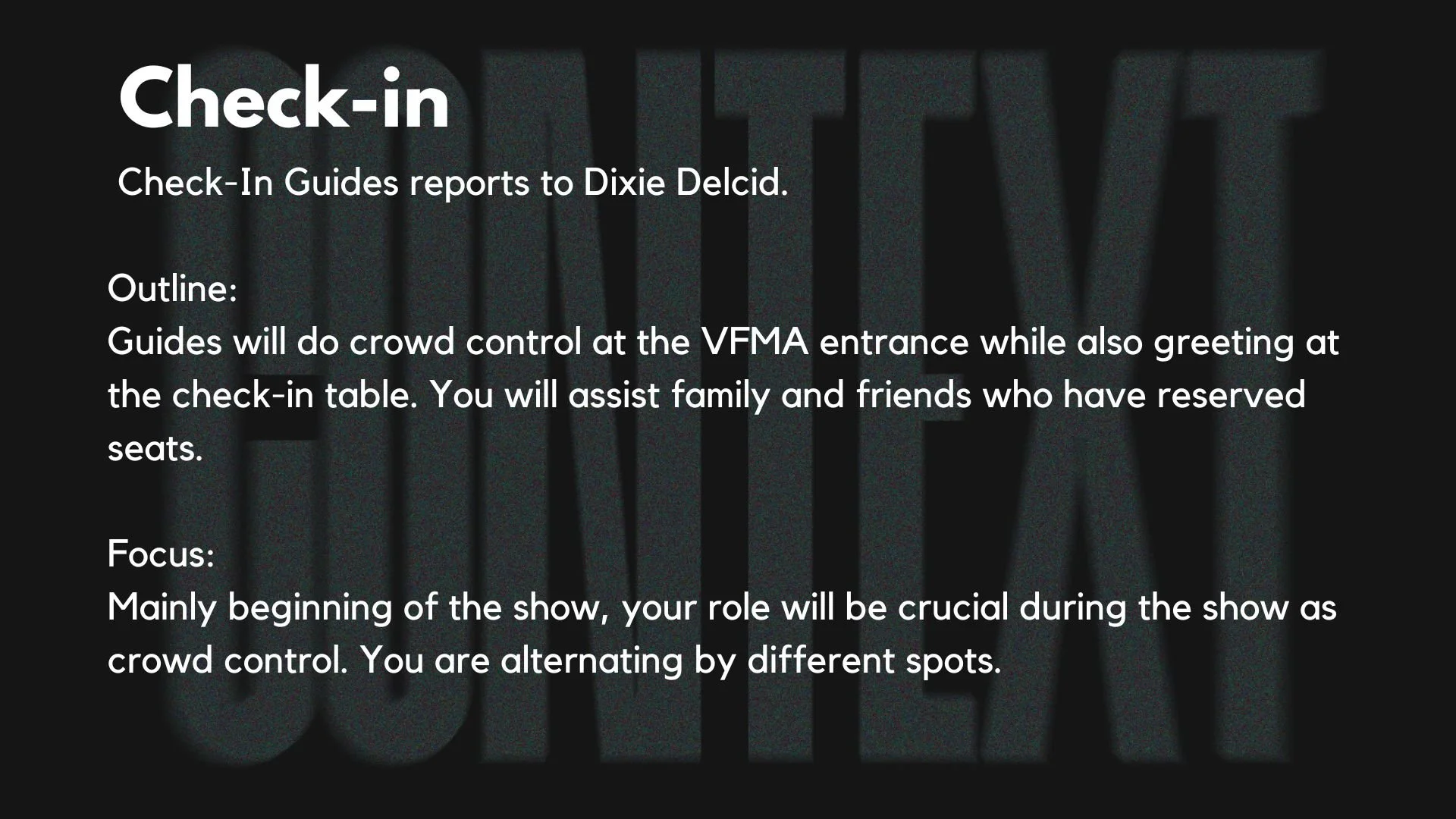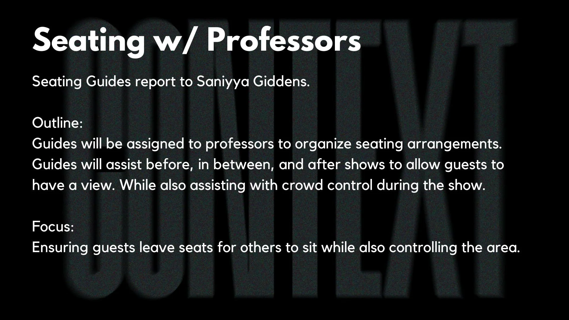 In preparation for the show, our committee conducted a training session for the event guides, outlining essential responsibilities and reviewing the timeline for both the dress rehearsal and the main event. The guides were crucial in managing crowd flow and directing guests to their seats, contributing to an organized and welcoming experience for all attendees.