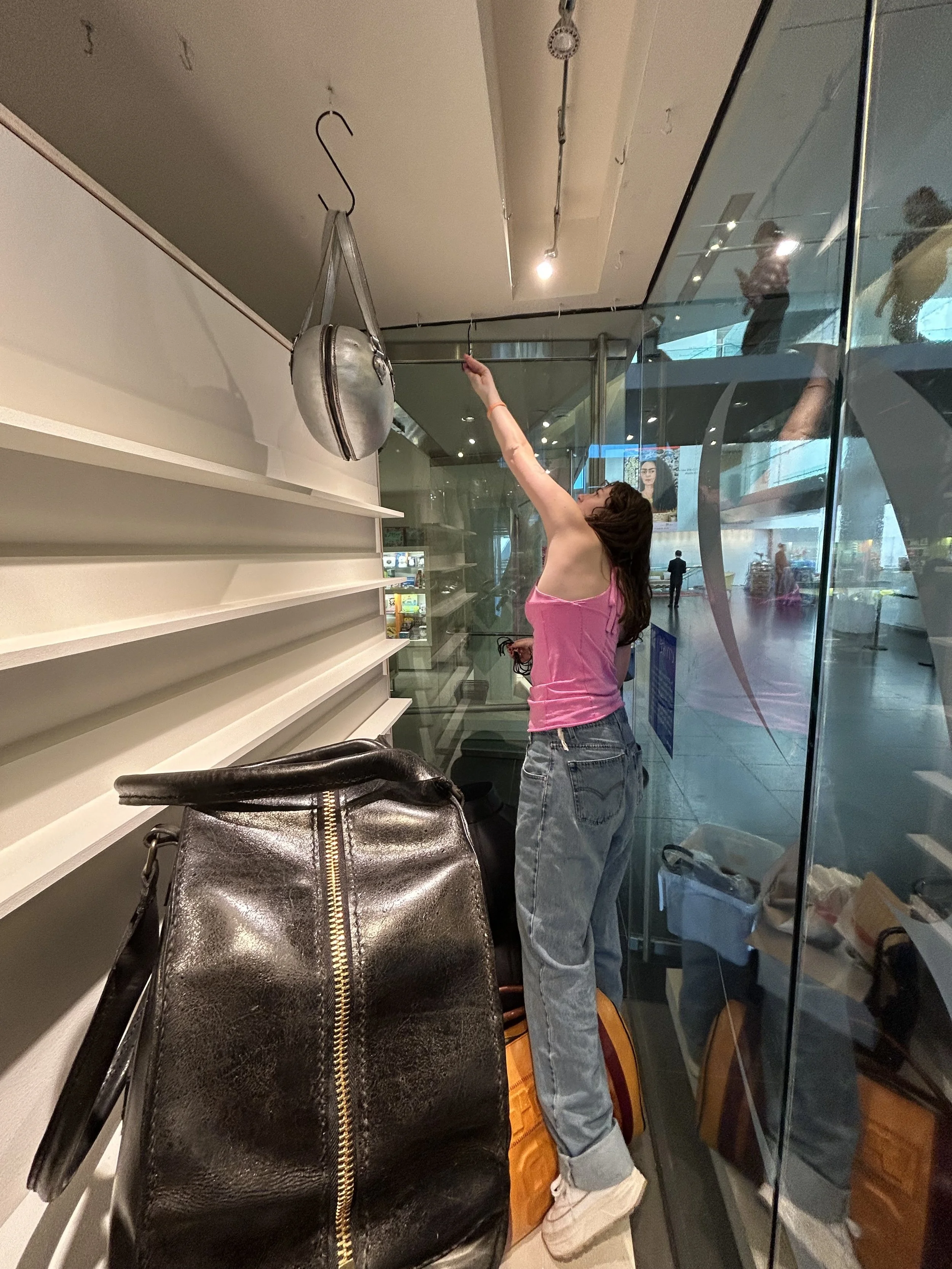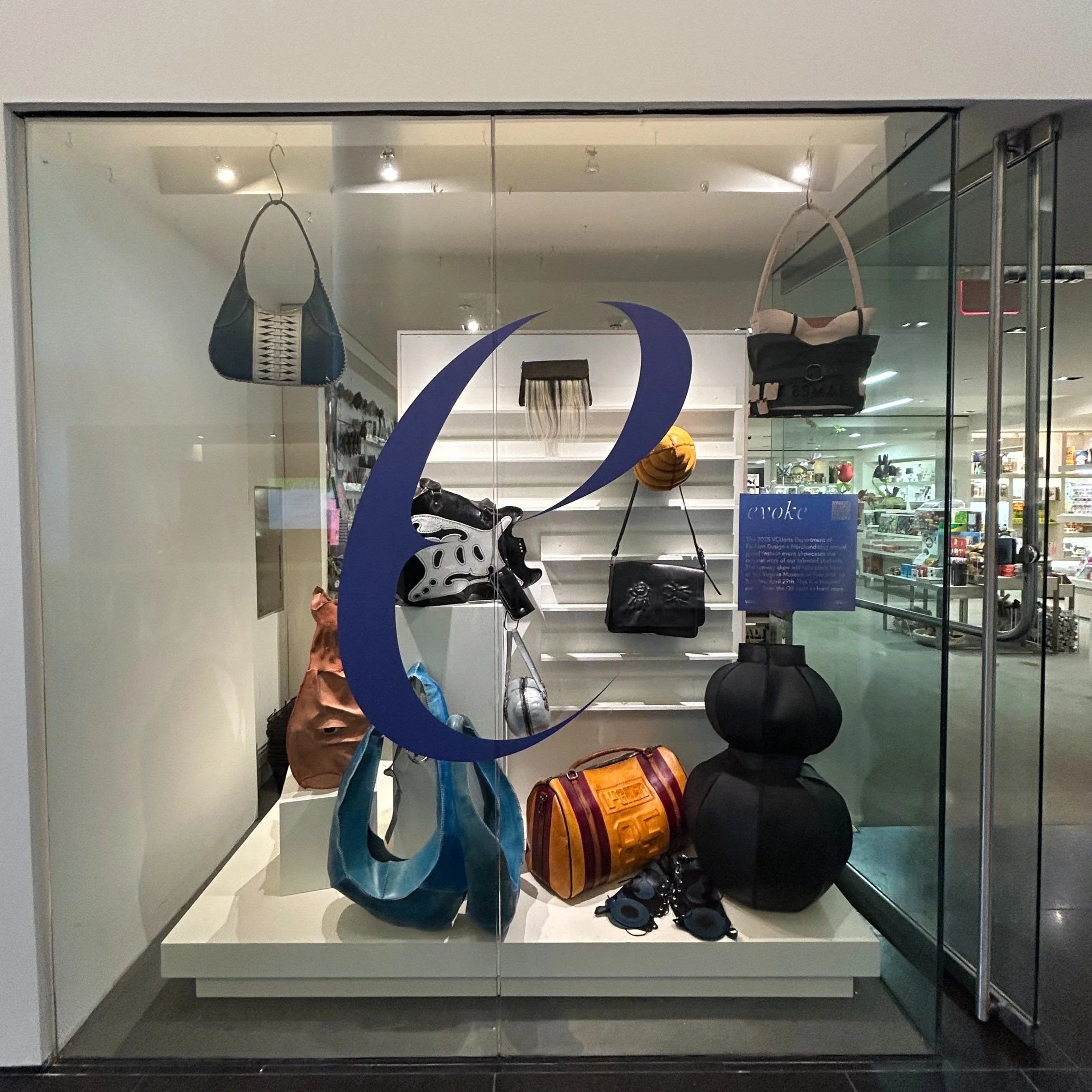 As part of the leather-making course, fashion designers' bags were featured in the Virginia Museum of Fine Arts window display.