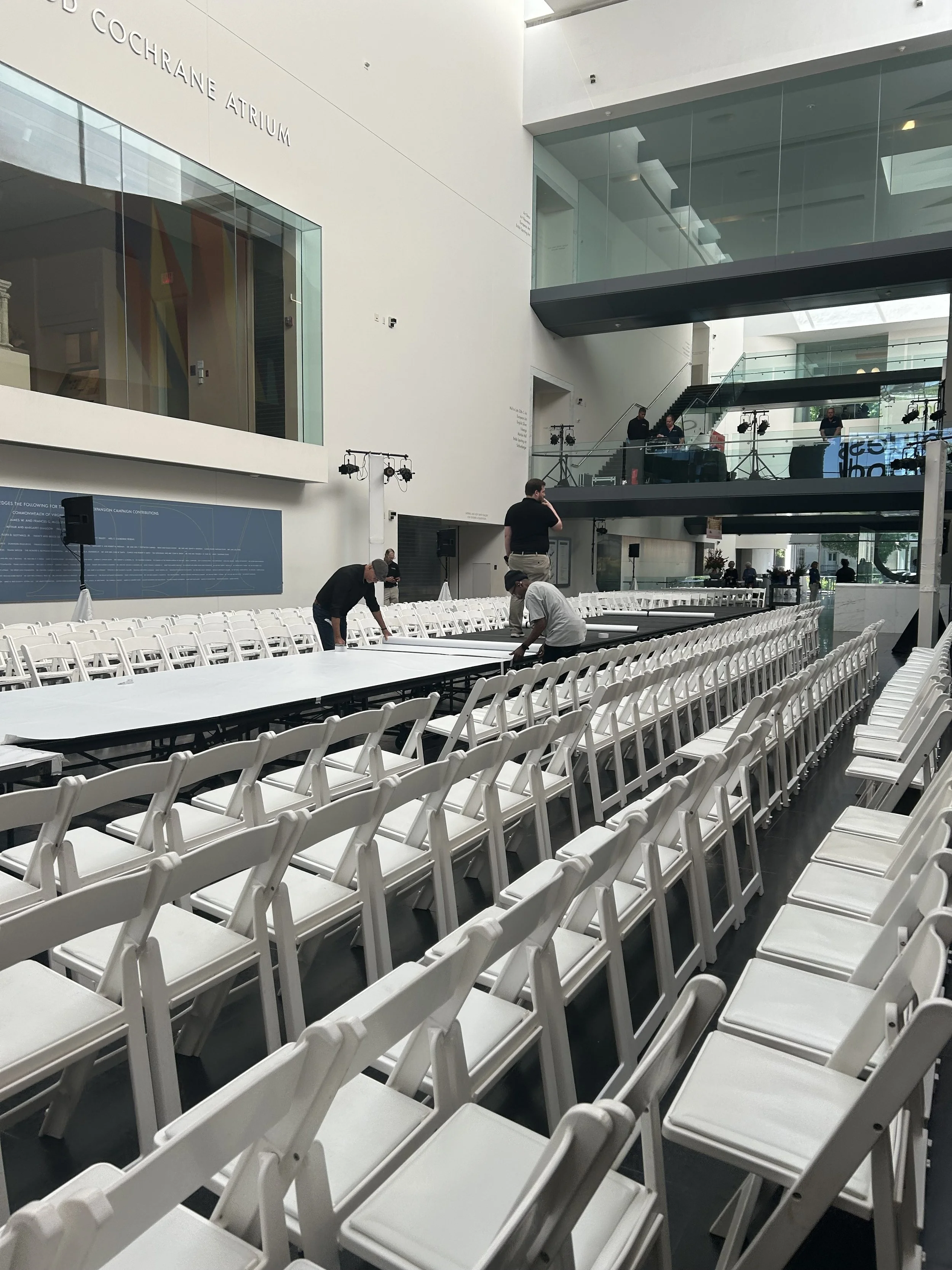 Once we arrived, we unloaded everything and set up the back-of-house, while the runway, chairs, sound, and screen were being installed.